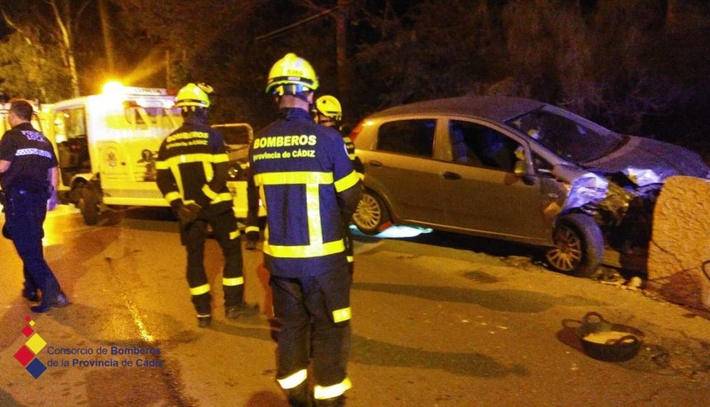 Efectivos del Consorcio de Bomberos de la Provincia de Cádiz ,en el parque de El Puerto de Santa María han intervenido entre la noche del pasado martes y la madrugada de este miércoles en un accidente de tráfico registrado en Camino de los Enamorados, en la localidad portuense Un turismo, con dos ocupantes, que procedían de la playa de La Puntilla en dirección a La Ronda, se empotró contra la doble viga que delimita el pinar de las Dunas de San Antón.