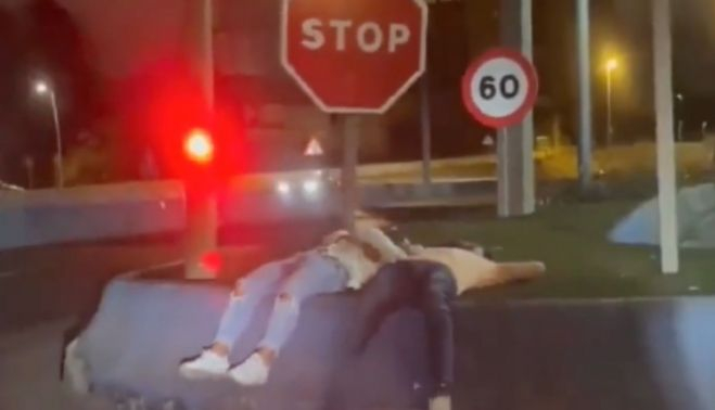Los jóvenes en cuestión se quedaron dormidos en una isleta que delimitaba un cruce, al lado de un Stop y tras una larga noche. Las imágenes han sido compartidas por SocialDrive.