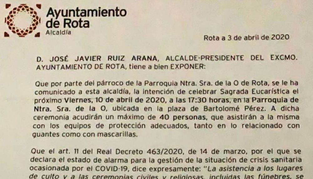 El alcalde de Rota, el socialista José Javier Ruiz Arana, ha tomado la decisión de recular tras permitir en un documento habilitante una misa este Viernes Santo con representantes de todas las hermandades de la villa. El aforo permitido era de 40 personas, con un máximo de tres por cofradía, en la iglesia de Nuestra Señora de la O, pleno centro de la localidad.