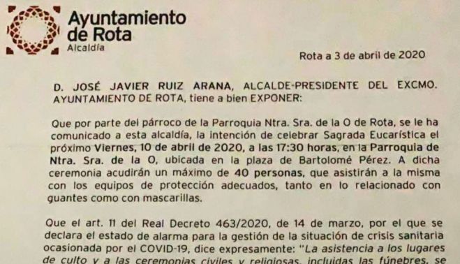En un documento firmado de su puño y letra, el alcalde socialista habilitaba "al portador" a acudir a la celebración religiosa, basado en las excepciones marcadas por el real decreto del estado de alarma para este tipo de actos, pero para los que no hay detalles de aforo más allá de que se cumplan las medidas de seguridad básicas. En los últimos días, según el periódico local Rotaaldia, se han estado produciendo otras celebraciones con motivo de la Semana Santa con alrededor de una veintena de personas.