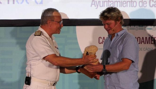 El marino viajó desde la Bretaña francesa hasta Cadiz para recibir en persona el primer premio que otorga la Asociación Cadiz con Elcano el día 8, tan sólo dos días antes de cumplirse los 500 años de la partida de la expedición española que completaría en 1522 la primera vuelta al mundo, bajo el mando de Juan Sebastian Elcano, considerada por los historiadores como "la mayor gesta marítima de todos los tiempos".