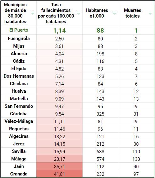 La localidad de El Puerto es la localidad de más de 80.000 habitantes donde menos gente ha fallecido proporcionalmente al número de personas. La tasa es de 1,14 por cada 100.000 habitantes, un cálculo realizado para dimensionar la mortalidad del virus según el tamaño de la localidad.