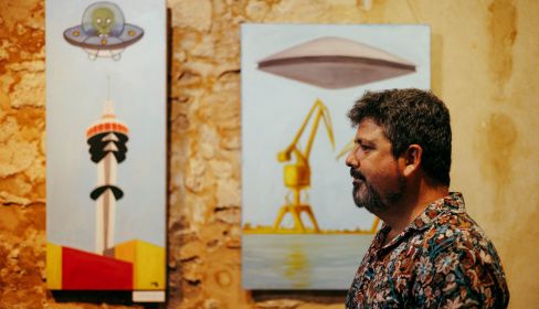 ¿Puede una cuarteta de un popurrí servir de inspiración para una exposición de cuadros? ¿Puede generar una pintura, a través del humor, una sátira de la turistificación y del eterno problema del aparcamiento? En la cabeza de Mikel Gil, sí, y si además el escenario es Cádiz, todos los planetas se alinean para que Los Titis de Cai, chirigota del Selu de 1994 haya provocado que un artista pinte desaforadamente paisajes de Cádiz con extraterrestres queriendo aparcar como locos sus platillos volantes allá donde haya un hueco.