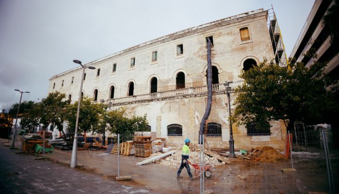Los operarios no paran quietos una mañana de enero en las avenidas de la Bajamar y Micaela Aramburu en El Puerto. Las obras del antiguo Hospital San Juan de Dios siguen su curso para devolver su esplendor a este edificio construido a finales del XVII y principios del XVIII, que llegó a entrar en la Lista Roja de patrimonio de la asociación Hispania Nostra.