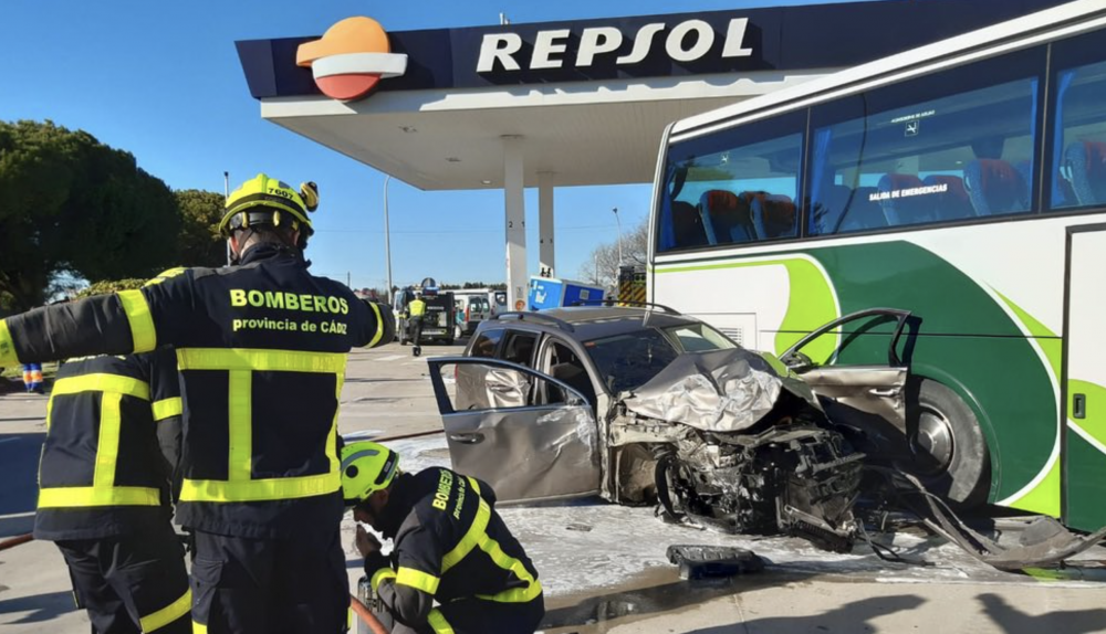 Un total de cuatro vehículos del parque de Bomberos de El Puerto han intervenido en este accidente con dos autobombas urbanas, un coche de rescate y otro de mando y apoyo logístico. La Guardia Civil y servicios sanitarios también han estado trabajando en la zona tras el suceso.