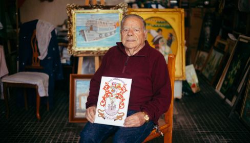 Manuel sujeta una foto en la que aparece en el interior de este histórico inmueble mientras se dispone a compartir su historia de vida. Una larga trayectoria marcada por su inquietud por el arte. “Yo recomiendo que todo el mundo que tenga afición a la pintura, que empiece por dibujar”, dice a lavozdelsur.es este querido pintor que ha tratado el óleo, el acrílico o la acuarela.