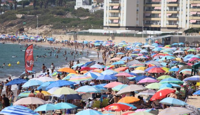 Playas abarrotadas, bandera verde y el gran efecto de la superluna de agosto en los arenales de la Bahía de Cádiz. En playas como El Buzo y Las Redes, en El Puerto, se ha cotizado muy caro el metro cuadrado de sombrilla, teniendo en cuenta una pleamar que ha dejado casi sin arena a este ya de por sí habitualmente concurrido rincón veraniego del litoral gaditano.