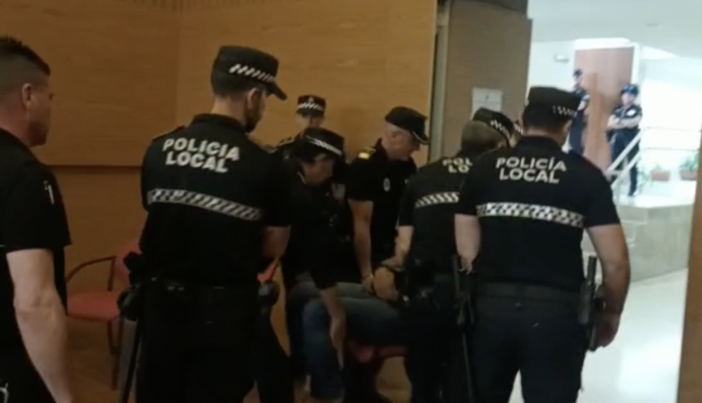 Su compañero se quejó de que "no se le ha dado ni un aviso, ¿esto es democracia?". Finalmente, entre varios agentes decidieron llevarse al policía local sentado en la silla.