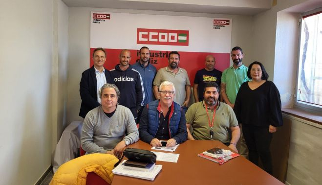 El secretario de Industria provincial, Juan Linares, el portuense Francisco Fernández, y demás delegados sindicales, se han reunido este jueves con el secretario general del PSOE portuense, David de la Encina, la concejala Mónica Jiménez y Juan Manuel Sánchez, que les han expresado su apoyo.