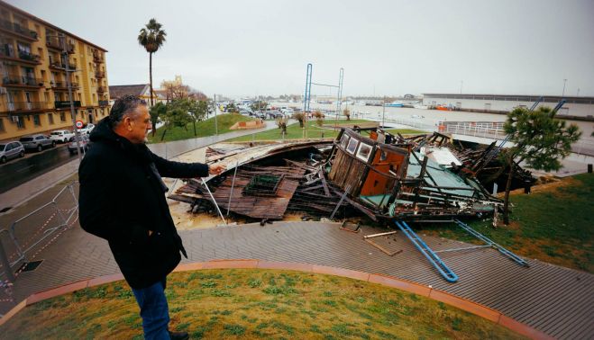 El portuense mira los restos del Adriano III una mañana de lluvia y viento marcada por el temporal que ha terminado de derrumbar a este icono. Como él, una mujer se acerca a las vallas de seguridad para hacerle una foto a la embarcación hecha añicos. Este martes, son muchos los portuenses y visitantes que lamentan el estado en el que ha quedado este “barquito pinturero” que recorrió la Bahía entre 1955 y 2011.