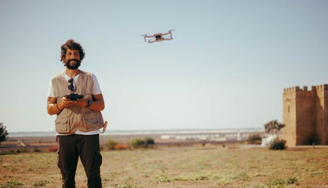 Un pequeño dispositivo sobrevuela el yacimiento arqueológico de Doña Blanca en El Puerto. En el cielo azul que arropa a la Sierra de San Cristóbal se divisa un punto negro. Nada de ovnis. Es un dron manejado por un hombre que ha sido pionero. Antonio Pecci, de 36 años, hace volar un aparato que le ha dado muchas alegrías.