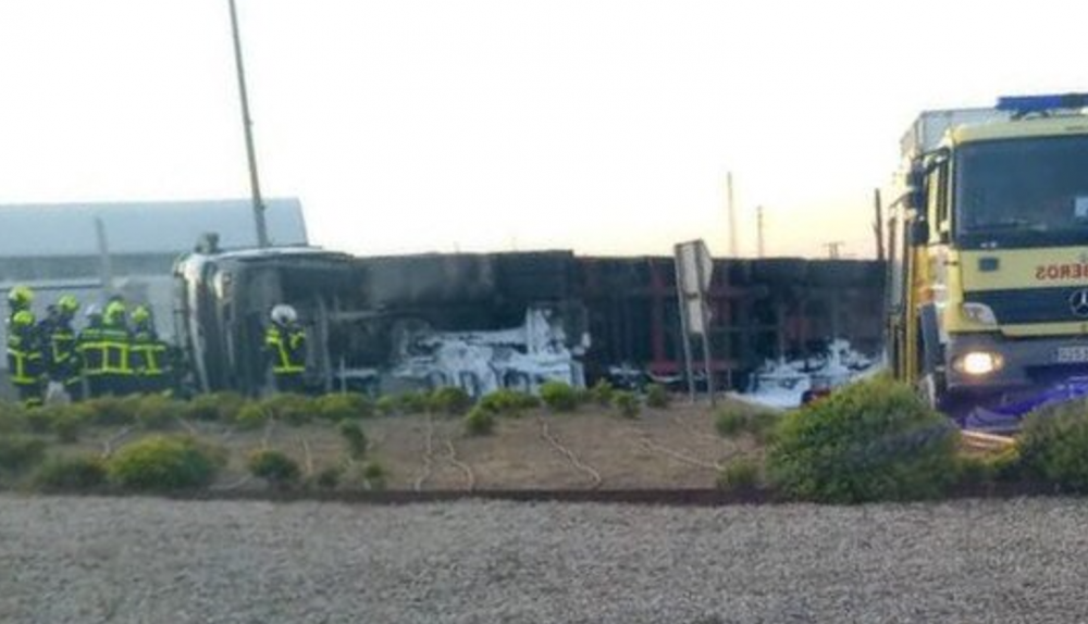 En el lugar, los bomberos vieron cómo el tráiler, que transporta placas solares, ha caído sobre el costado del copiloto.