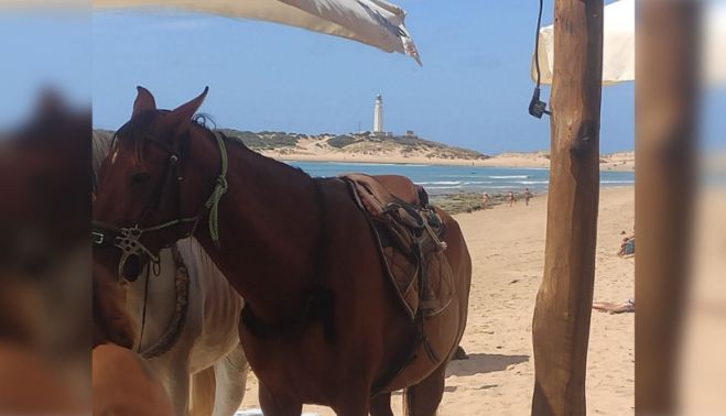 En la misma se ve a dos caballos en la puerta del chiringuito La Rubia con la imponente figura del Faro de Trafalgar de fondo. Una maravillosa estampa de Los Caños, que en septiembre no pierde su categoría de paraíso.