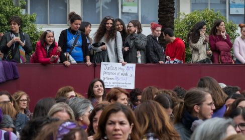 "Ya está bien, si no nos unimos nunca lo conseguiremos", expresa con fuerza Paula, una joven estudiante del grado de Criminología y Seguridad del Campus de Jerez. Junto a ella, otras dos compañeras de clase, María y Laura, se suman a la primera huelga feminista convocada en España. "Tenemos que luchar por nuestros derechos y representar a las que no pueden venir hoy", exclama Laura. Otro grupo de amigas, de profesoras o jubiladas, también está presente en la plaza "para que en el futuro las mujeres tengan otras opciones, una igualdad real y definitiva", comparte Amparo. Cerca de ellas, una madre acude al encuentro con sus dos hijas. "Mi pareja me dijo que no las trajera, que él se quedaba con ellas, pero las traigo porque son mujeres en potencia", relata Irene.