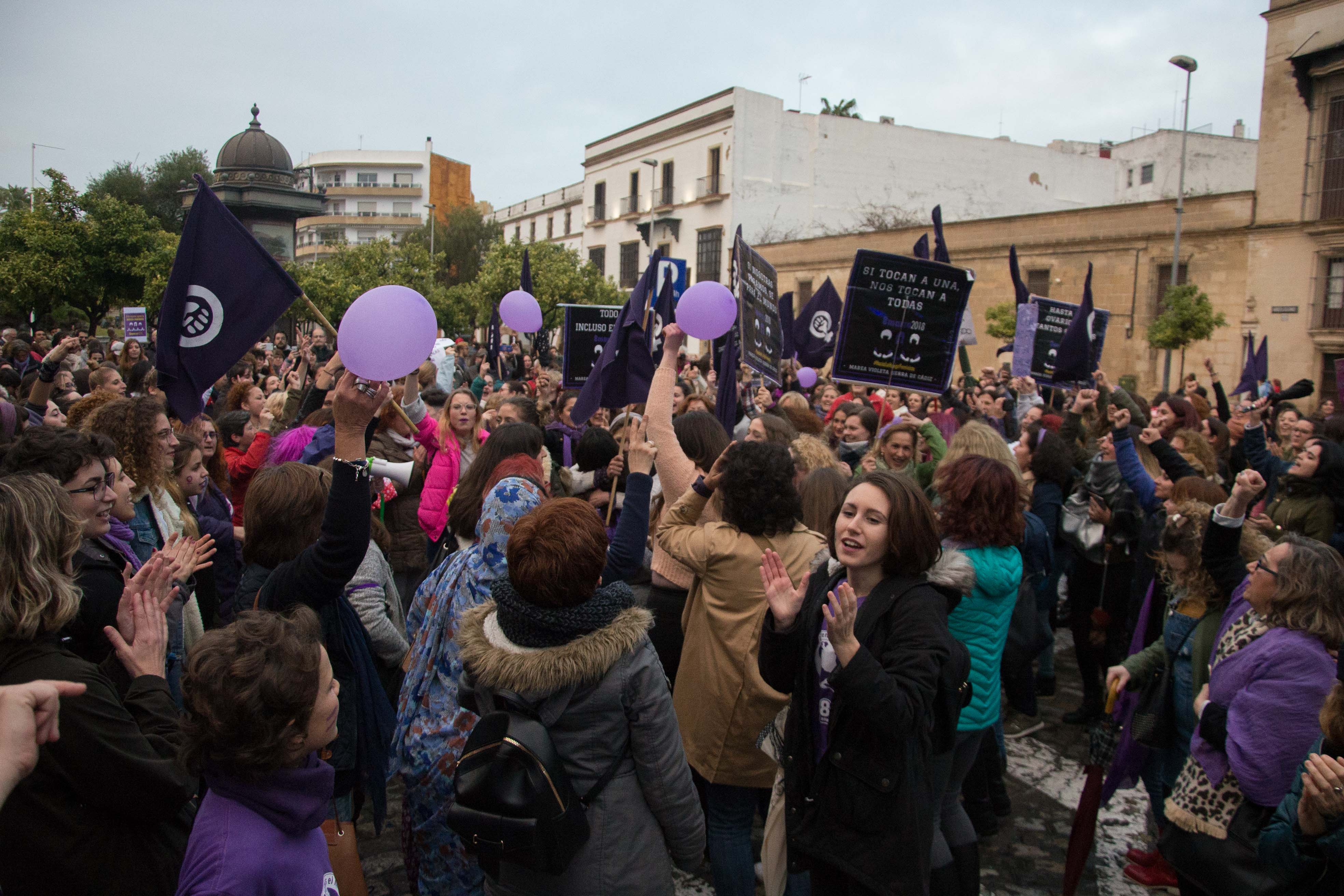 En la mañana del 8 de marzo, Día Internacional de la Mujer, diferentes ciudades del país se concentran en las plazas mayores para leer manifiestos, reclamar los derechos de las mujeres y llevar a cabo diferentes actos en materia de igualdad de género. La plaza del Arenal, en Jerez, se encuentra abarrotada. Los palcos sirven de grada para aplaudir o grabar con el teléfono móvil. Las voces femeninas que pasan por el atril piden un cambio, una revolución con nombre de mujer para alcanzar, de una vez por todas, la igualdad real en la sociedad. Periodistas, educadores, pensionistas, estudiantes... Todas las edades, todas las personalidades quedan representadas en una concentración histórica.