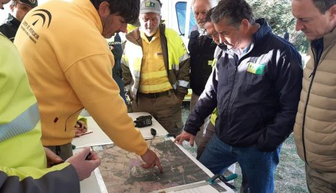 El equipo de bomberos forestales ha mantenido una reunión de coordinación este Viernes Santo en el Puesto de Mando Avanzado del Incendio Forestal, donde la situación mejora.