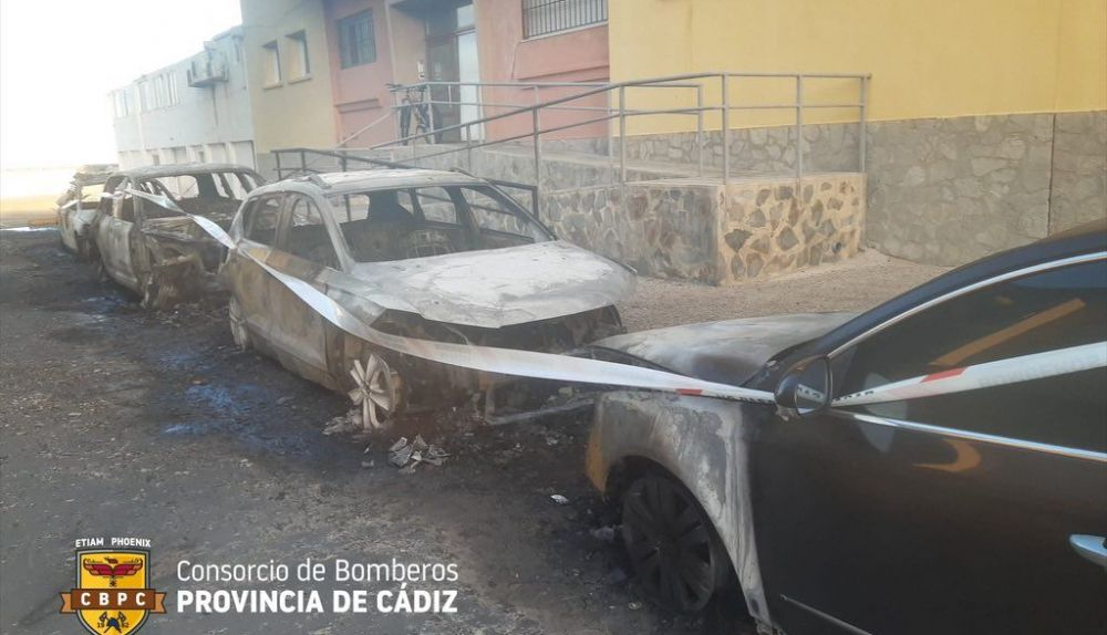 Un gran susto se han llevado los vecinos de la barriada Juan de Austria de Tarifa tras comprobar cómo cuatro coches se encontraban en llamas.