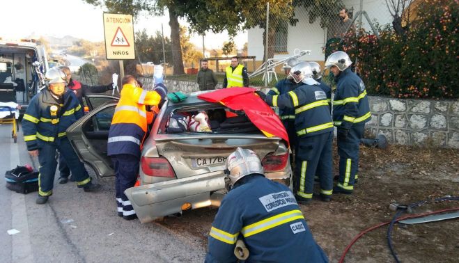Los Bomberos intervienen durante hora y media para rescatar a los accidentados, que han sido trasladados al Hospital de Jerez.