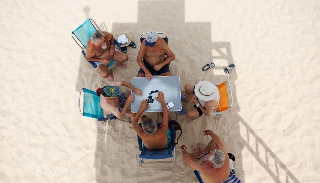 Lo hace con un grupo de hombres más o menos de su misma quinta, de procedencia heterogénea, que se reúnen cada día en la arena a la sombra de una torre del socorrista en la Costilla. Una mesita, un dominó y la correspondiente carga. Un jerezano, Modesto, ha presenciado lo que ha crecido Rota en estos años. Los días más masivos del pasado fin de semana por la ola de calor, y otras jornadas más tranquilas cuando no es el termómetro para tanto.
