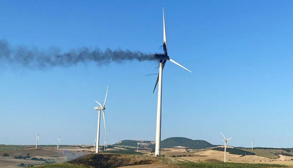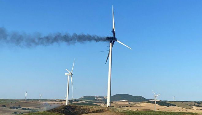 Las espectaculares imágenes de la turbina en llamas, dejando una estela de humo negro, es visible a varios kilómetros de distancia. El incendio tiene lugar en el parque eólico Chorreaderos Altos 7, en la finca conocida como La Lapa.