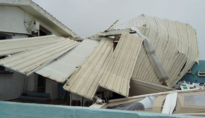 El techo del club social, ubicado en la urbanización Playas del Estrecho de los Caños de Meca, ha salido volando, y se ha llevado por delante mesas y sillas que había en la terraza del establecimiento.