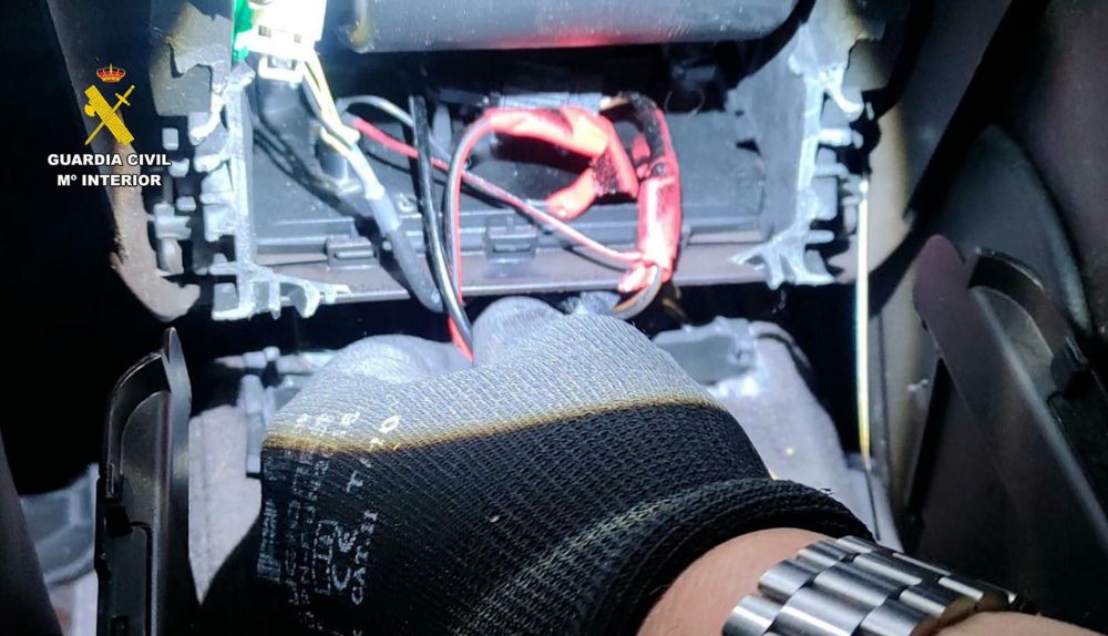Ante esta situación, el turismo fue sometido a una inspección pormenorizada por parte de la Sección Fiscal de Cádiz, con la participación de especialistas de la Oficina de Análisis e Investigación Fiscal (ODAIFI). Durante el registro, los agentes localizaron un sistema de cableado conectado a un interruptor oculto en el reposabrazos, que permitía activar el mecanismo del doble fondo.