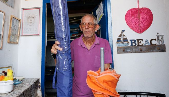 Durante muchos años, ya no, hubo quien no se quería complicar y se dedicó a colocar sombrillas en Rota cada mañana. Desde las 8 de la mañana. Sombrillas de particulares en la Costilla, la principal playa urbana de Rota. El plan es el siguiente: al comienzo del verano, le dejas a Juan tus sombrillas y tus sillas y en lugar de tener que subirlas a tu casa o apartamento tras la jornada de playa, las dejas allí, en un local. Antiguamente, Juan no solo las guardaba, sino que la clavaba en la arena para que cuando llegaras ya tuvieras tu sitio. "Eso ya no", cuenta. "Era mucho trabajo". Hubo quien se quejó porque al final eso era guardar el sitio.