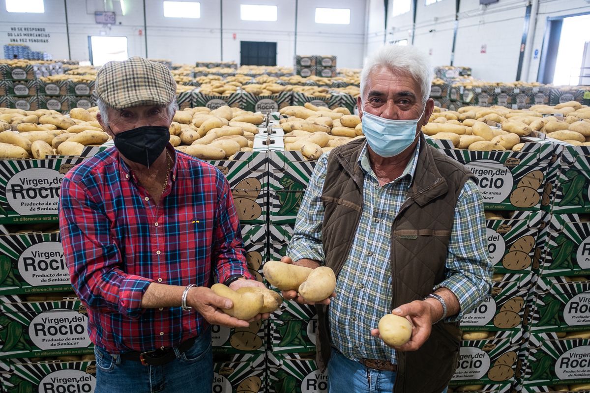 Luis Raposo y Diego Parada son dos los vecinos que nacieron en una Algaida puramente rural. Ambos tienen 64 años y toman un vino y una cerveza en la cafetería de la cooperativa Virgen del Rocío, una de las existentes en torno a la patata. "La papa este año está medio valiendo. El año pasado estaban a 15 y 20 céntimos el kilo". Cuentan que la patata da más trabajo que el vino y los langostinos en Sanlúcar. La Algaida es un motor que no se apaga. "Aquí, de 18 años para arriba, el que no estudia, trabaja. Trabaja todo el mundo. Tengo cuatro hijos y todos están en los mercados", dice Luis. La patata de Sanlúcar es especial "por la arena. No la hay en ningún lado. Es la mejor papa del mundo". "Las papas de Conil son buenas, ¿eh?", defiende Diego. "Ts, hablamos de tierra fina, esa es de tierra gorda". La piel, dice, es más dura, pero la de Sanlúcar "tiene para todo. Sin papas, y sin zanahorias, no valemos nada".