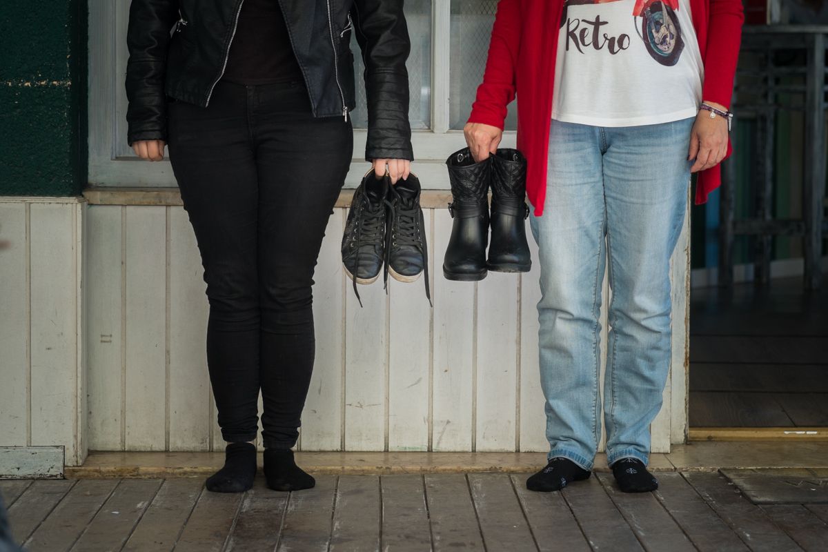Jessica e Inmaculada posando junto a sus zapatos "ausentes", para visibilizar la Encefalomielitis Miálgica. FOTO: MANU GARCÍA.