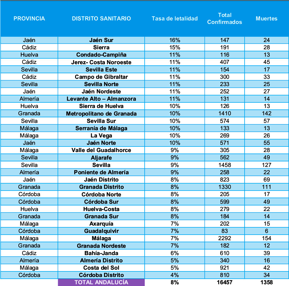 Estas dos cuestiones hay que ponerlas en orden para explicar un punto relevante: la tasa de letalidad, es decir, el número de fallecimientos entre el número de contagios. Y los distritos sanitarios de Sierra, Costa Noroeste-Jerez y Campo de Gibraltar están por delante de la media andaluza. La primera explicación es las muertes en residencias de ancianos, con focos en La Marquesa (Jerez), Ubrique y Alcalá del Valle. Pero la realidad va más allá. Porque focos ha habido en todas las provincias donde hay casos relevantes en Andalucía. Las dos que están a la cola en casos, para su suerte, son Huelva y Almería. En las demás hay una gran incidencia o casos muy letales. Ahí se lleva la palma, por desgracia, Sevilla, con varias residencias muy afectadas.