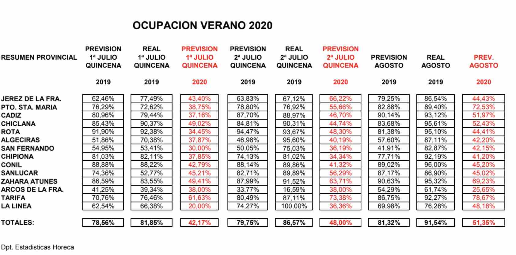 Por su parte, la capital gaditana, que en la primera quincena de julio de 2019 alcanzó una ocupación real del 79,44%, cuenta para este año, en principio, con una previsión del 37,16%. Esto significa, que a excepción de Tarifa, que supera el 60% de ocupación, el resto de municipios no llega ni al 50% en la primera quincena de julio. En el caso de Jerez, la auténtica segunda línea de playa en el verano de la provincia, la previsión para la primera quincena de julio es del 43,40%, frente al 77,49% de ocupación el pasado año. Aun así, ese dato es la quinta mejor previsión de la provincia para esas fechas del verano post covid.