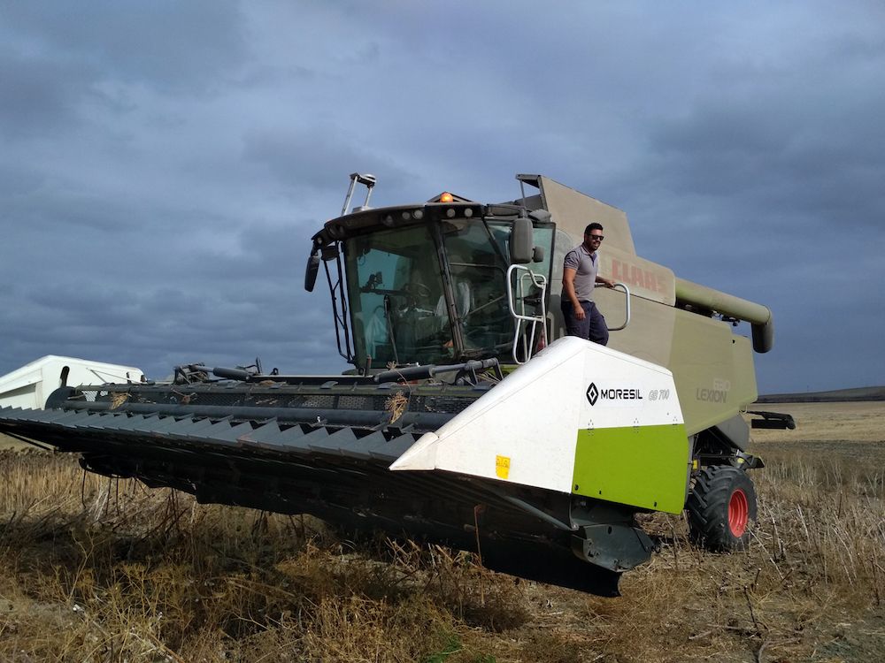 Germán Gilabert sabe desde chico que en verano no se va a la playa, que en agosto hay mucha faena en el campo, “ya descansaremos algo en Navidad”, dice sin un atisbo de queja. Trabaja de sol a sol, y no es para menos, este joven agricultor cultiva algodón, maíz, remolacha y hortícolas. Y no contento con eso, también trabaja para terceros, como en este caso, que se encuentra segando girasol cerca de Paterna.