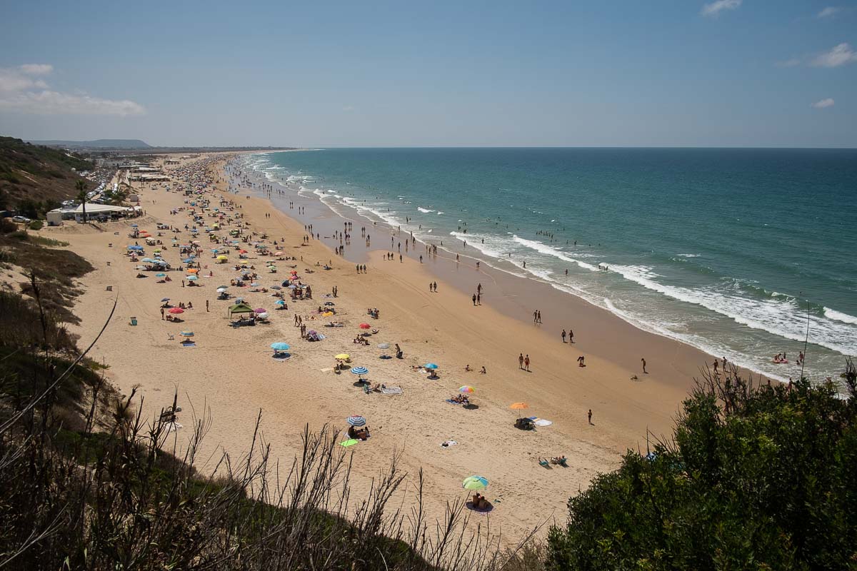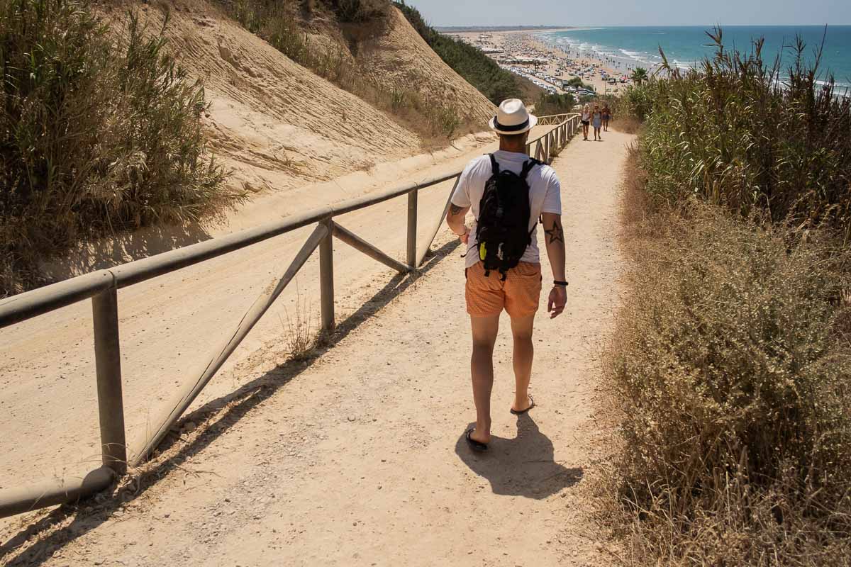 La vista desde lo alto de un escarpado, claro, impresiona. "Aquí no se cumple la distancia, vamos, que no, te lo digo". Frente al mar azul, un mar de sombrillas multicolores. Vuelvo a insistir y el fotógrafo escucha y asiente mientras bajamos un camino de tierra que serpentea entre algún arbusto hasta la playa de La Fontanilla, en Conil. La realidad es tozuda. "Ah, pues sí se cumplía, sí". Era un efecto óptico, de estos de ver desde lejos.