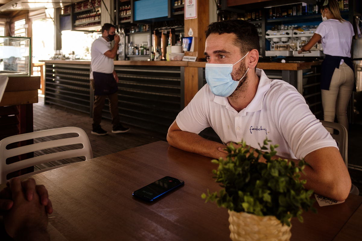 Roberto Sánchez es propietario del chiringuito Feduchy, en La Fontanilla. "Empezamos con mucho miedo e incertidumbre, las medidas no estaban claras. Hemos llevado todas las medidas, desinfecciones de mesa, limpieza de manos... Nos estamos acostumbrando", dice bajo una masacarilla en una mesa de su establecimiento. "El turismo está viniendo, ahora estamos funcionando muy bien", con excepción de la falta de extranjeros. Y eso se va a notar, sobre todo, en adelante, porque los visitantes de fuera ayudan a alargar las temporadas. "Nosotros estamos siete, ocho meses". Este año, menos, entre el confinamiento y las dudas a partir de septiembre. "A ver cómo viene ese turismo que es muy importante, para que la temporada no se quede en tres meses. A ver si se va ya el bicho este, hombre".