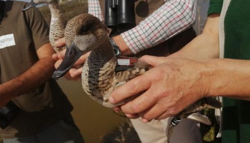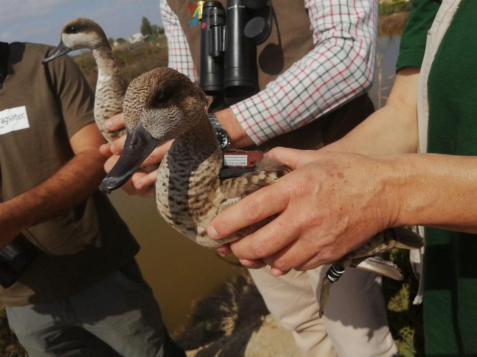 Técnicos de la Delegación Territorial de Agricultura, Ganadería, Pesca y Desarrollo Sostenible han liberado este viernes, en las marismas de Trebujena, dos parejas de patos en peligro de extinción. En concreto, son cuatro ejemplares de cercetas pardillas (Marmaronetta angustirostris) marcados con un dispositivo de seguimiento GPS.