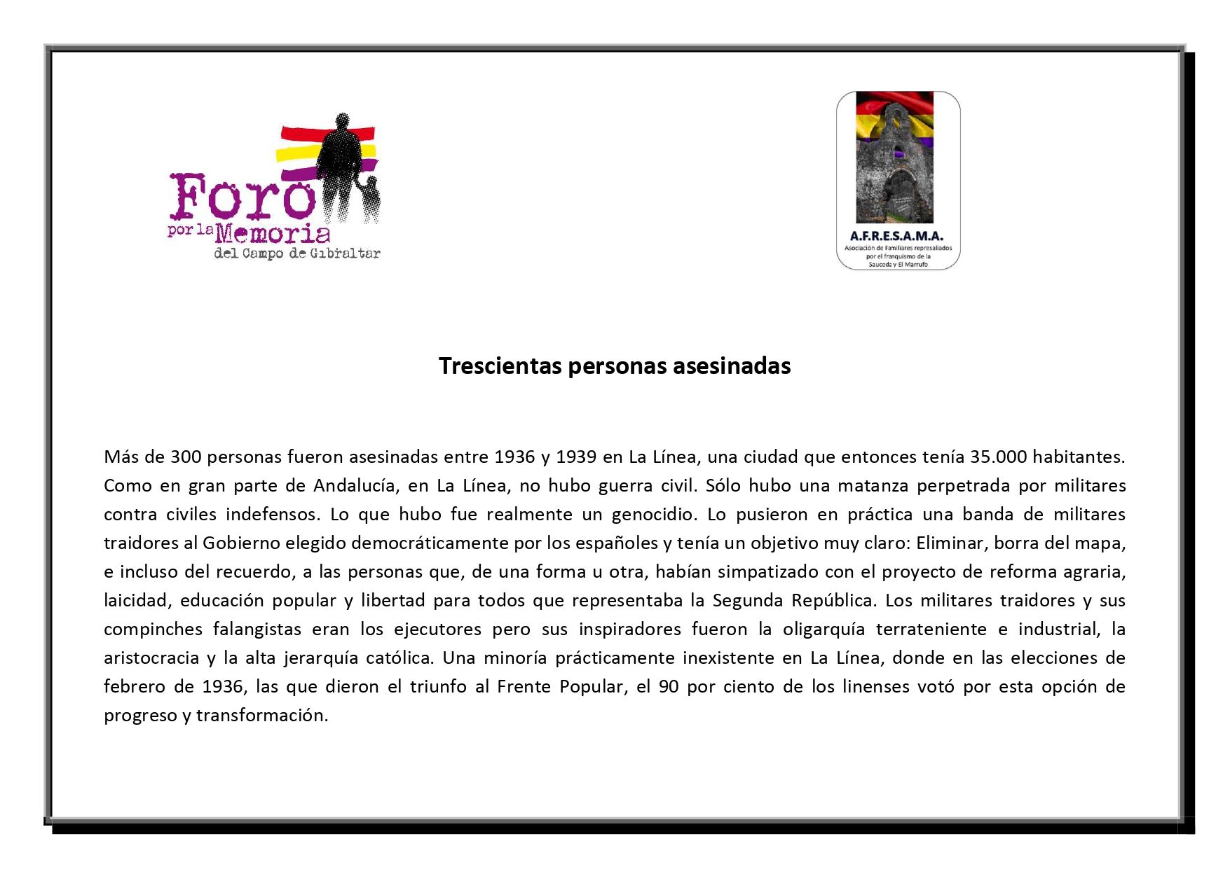 Los historiadores aseguran que en los fusilamientos de esa época no se hacían juicios ni se registraban por escrito las órdenes de matar. Y añaden que para saber la cifra exacta de los muertos hay que multiplicar por tres la conseguida por registros documentales. Por eso, aseguran que en La Línea los fascistas asesinaron a más de 300 personas. El foro distribuyó entre los asistentes a la reunión del palacio de Congresos una relación de los vecinos de La Línea asesinados entre 1936 y 1945 con sus nombres y apellidos, naturaleza, domicilio, edad, profesión y lugar y fecha de fusilamiento.