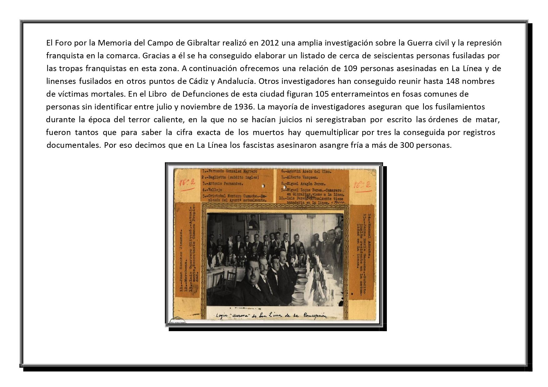 El Foro por la Memoria del Campo de Gibraltar realizó en 2012 una amplia investigación sobre la guerra de 1936-39 y la represión franquista en la comarca. En este trabajo obtuvimos una relación de 110 personas asesinadas en La Línea y de linenses fusilados en otros puntos de Cádiz y Andalucía. Otros investigadores han conseguido reunir hasta 148 nombres de víctimas mortales. En el Libro de Defunciones de este municipio hay un total de ciento cinco cadáveres sin identificar y ciento once con identificación en enterramientos efectuados entre julio y noviembre de 1936 por orden de la autoridad militar de los sublevados.
