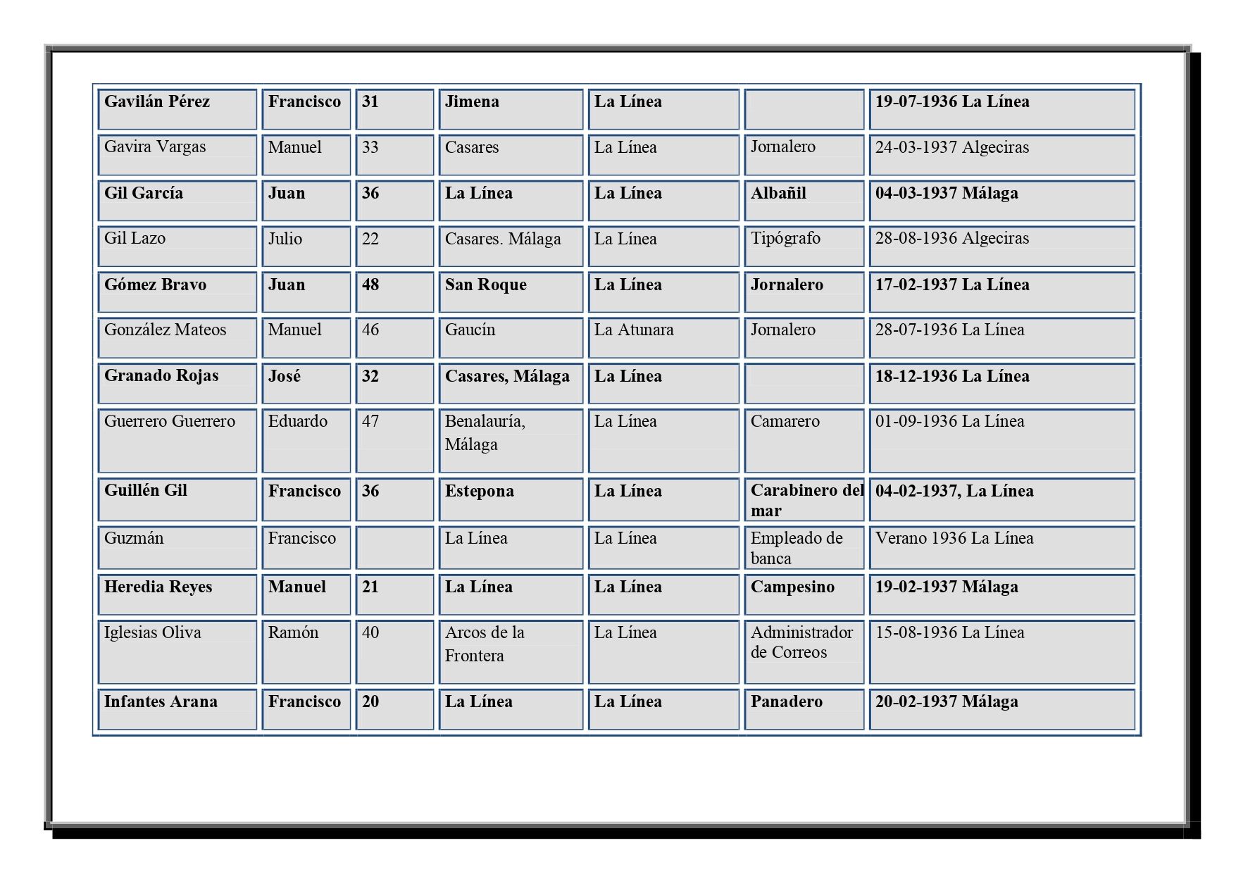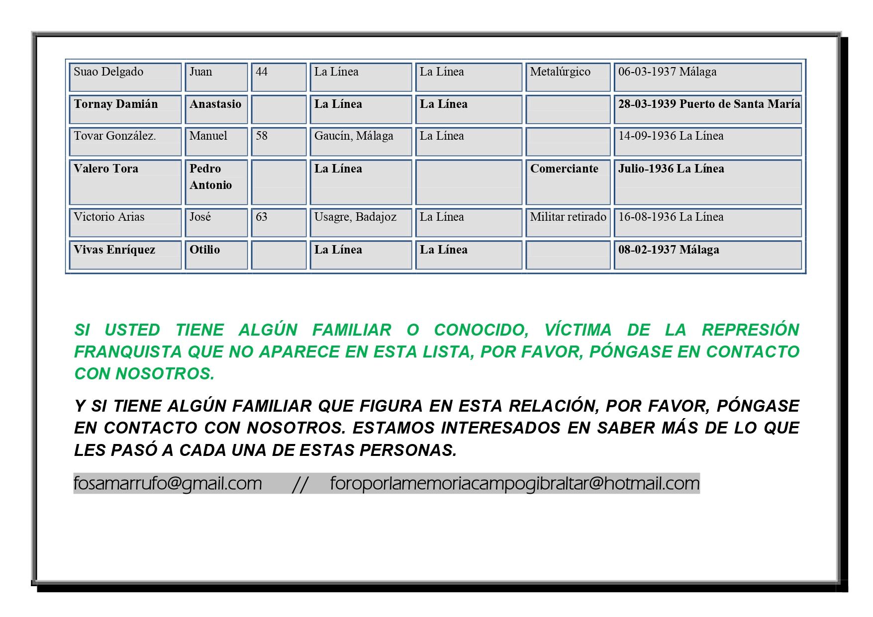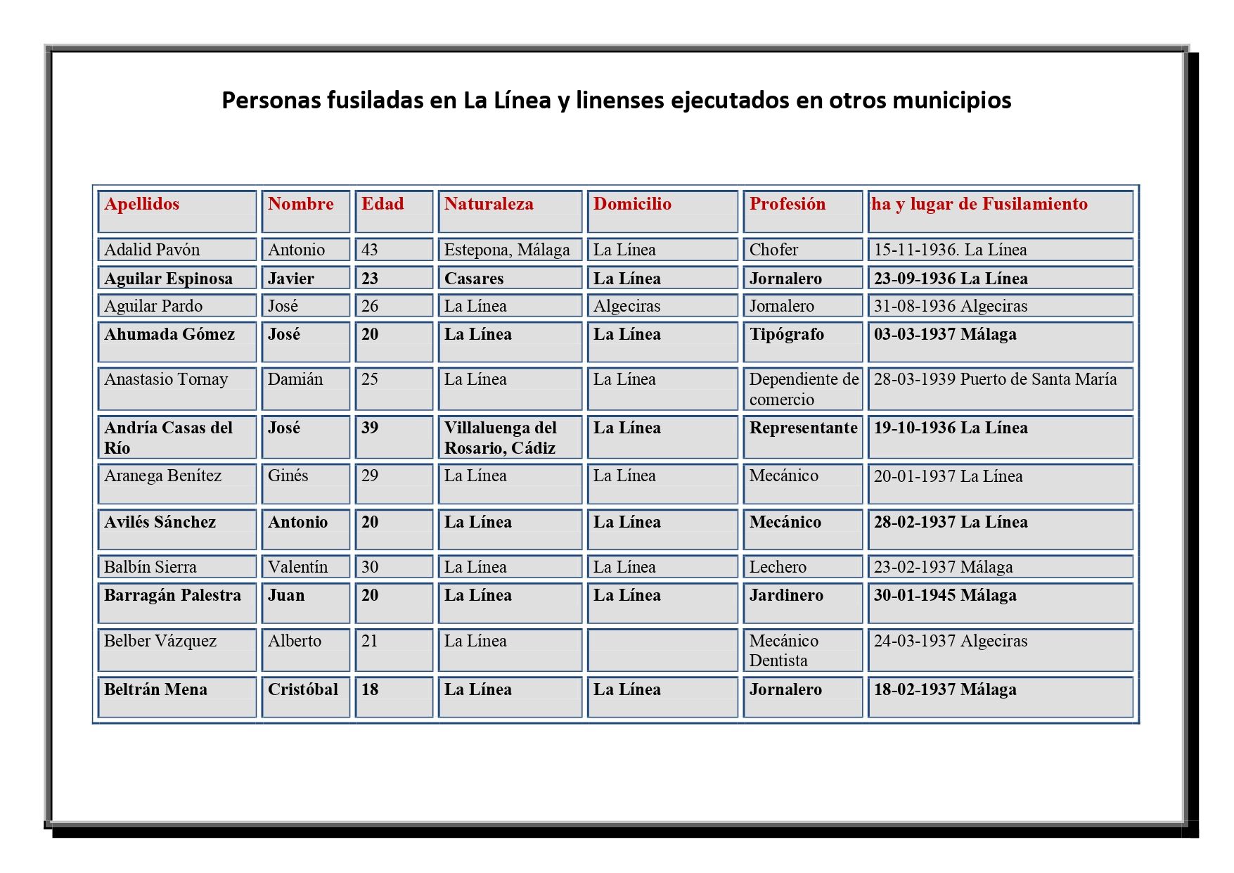 Las personas interesadas pueden consultar la relación de fusilados que se adjunta en las siguientes imágenes. El foro llama a quienes tiene a familiares desaparecidos a que se pongan en contacto con el Foro por la Memoria del Campo de Gibraltar o el Ayuntamiento de la Línea.