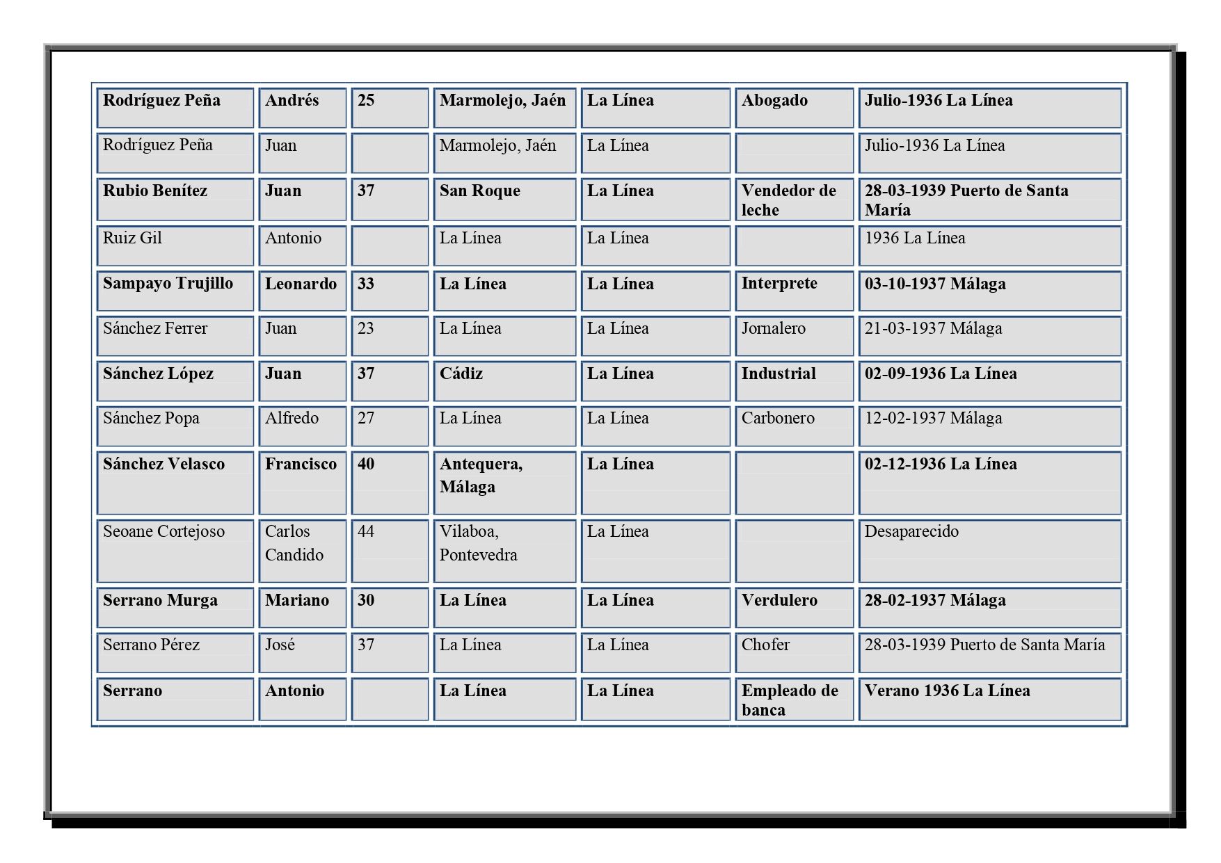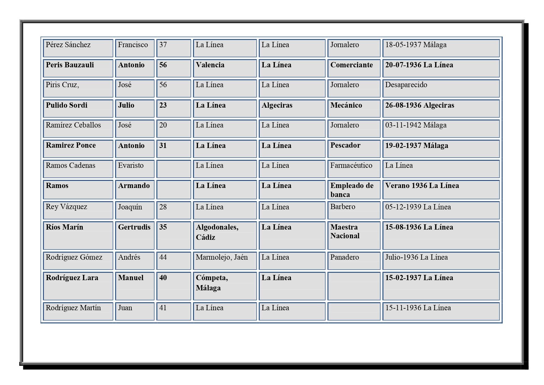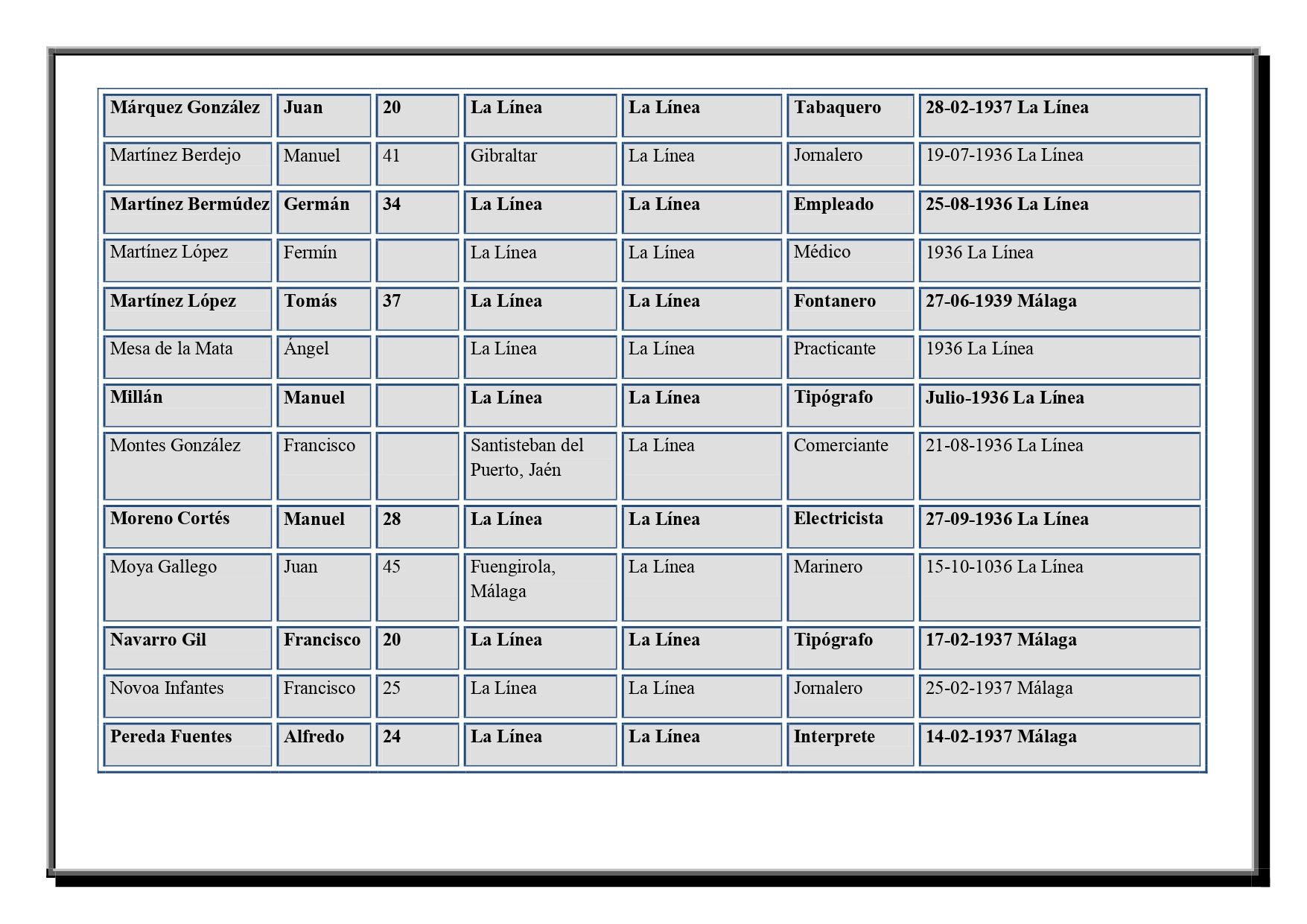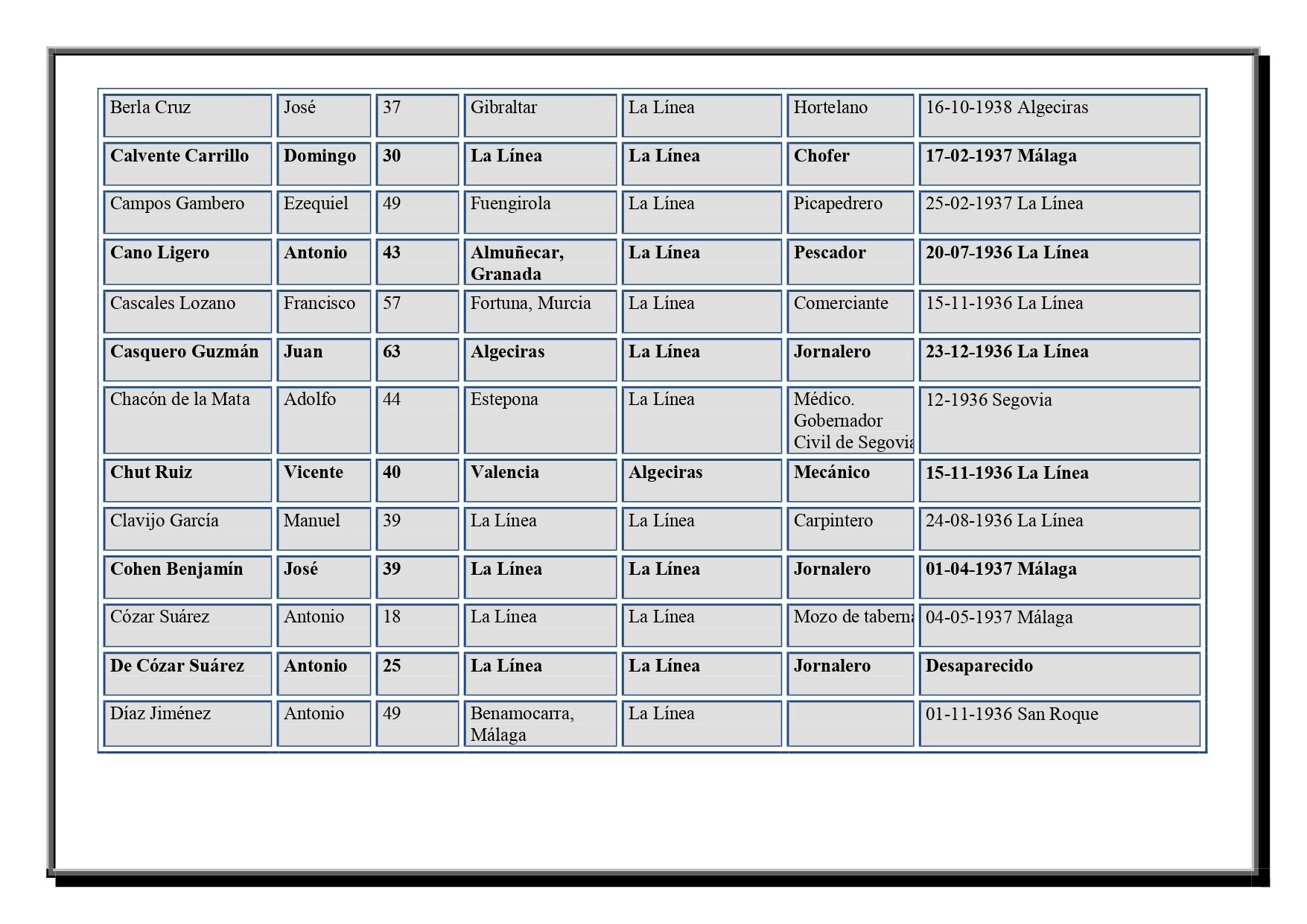 Las personas interesadas pueden consultar la relación de fusilados que se adjunta en las siguientes imágenes. El foro llama a quienes tiene a familiares desaparecidos a que se pongan en contacto con el Foro por la Memoria del Campo de Gibraltar o el Ayuntamiento de la Línea.