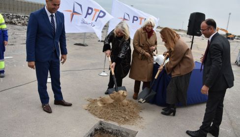 La presidenta de la Autoridad Portuaria de la Bahía de Cádiz, Teófila Martínez; la delegada territorial de Economía, Hacienda, Fondos Europeos y de Industria, Energía y Minas en Cádiz, Inmaculada Olivero y otras autoridades han sido testigos de la colocación de la primera piedra de un proyecto millonario que se instala en el muelle de La Cabezuela en Puerto Real.