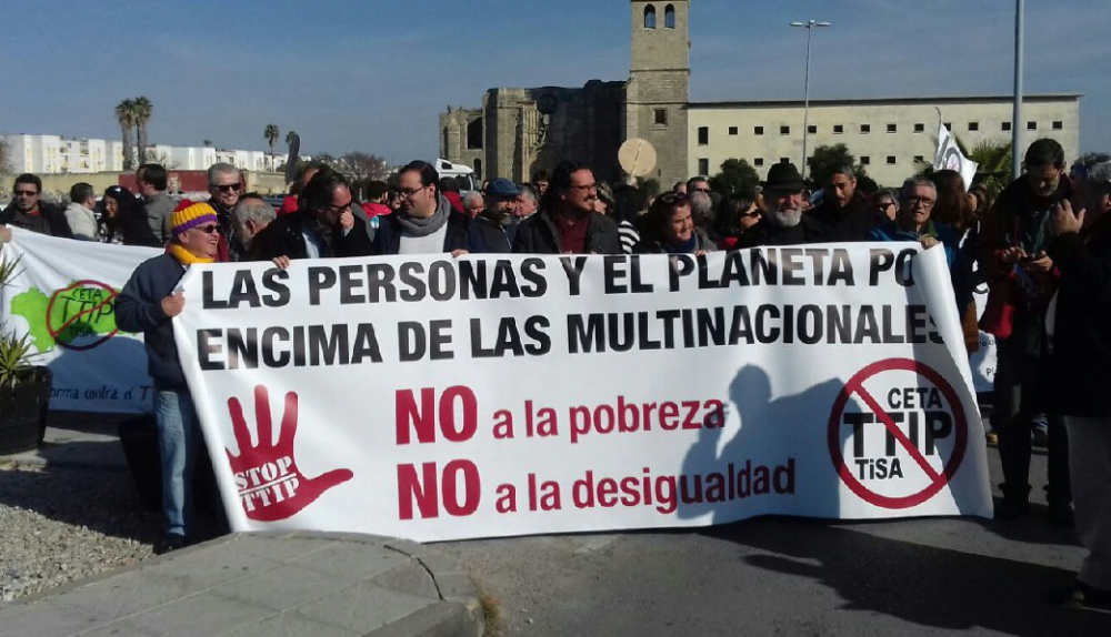 Más de 3,5 millones de ciudadanos europeos han firmado una petición en contra del CETA y su tratado gemelo, el TTIP, que negocian Estados Unidos y la Unión Europea. Por eso, la plataforma provincial Cádiz contra el TTIP organizó una manifestación en El Puerto, en la que participaron varios cargos públicos (alcaldes y concejales de algunos ayuntamientos de la provincia), así como miembros destacados de direcciones locales y provinciales de diversos partidos y organizaciones sindicales.