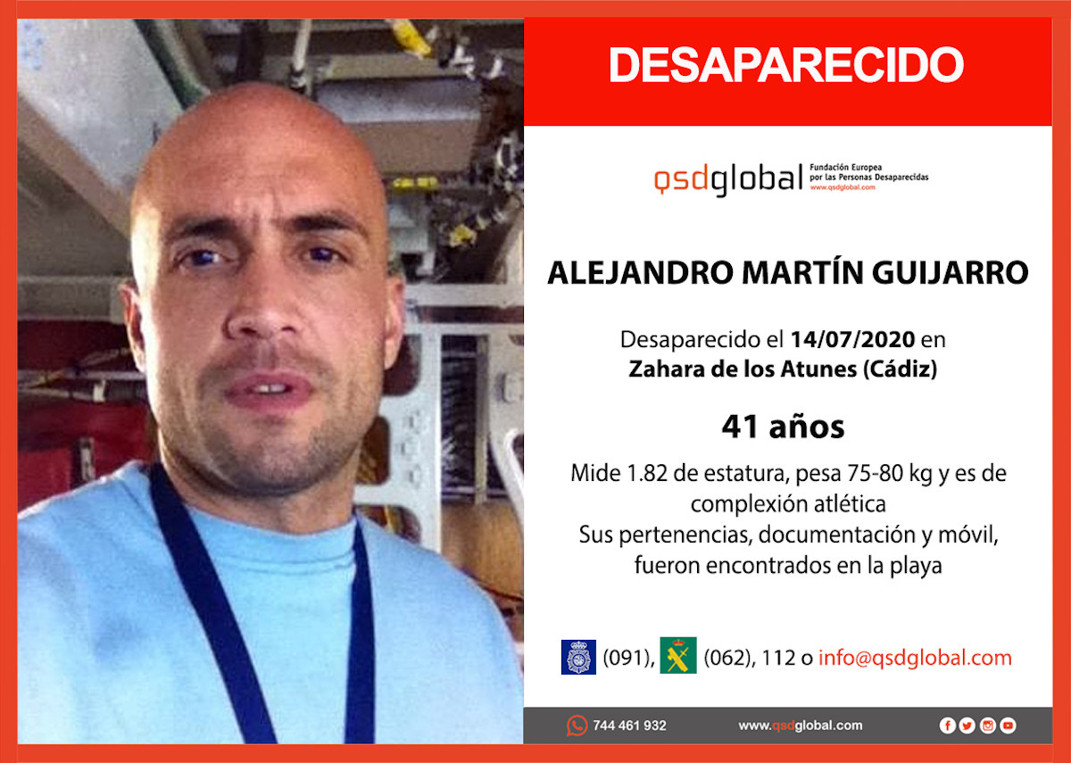 El madrileño Alejandro Martín Guijarro, técnico mecánico de Airbus en Sevilla, lleva 15 días desaparecido. El 14 de julio, este hombre de 41 años que vive solo en Bormujos se encontraba en la playa de Zahara de los Atunes disfrutando del mar. "Él es aficionado a ir a la playa, siempre ha ido mucho a hacer surf y a nadar, cada vez que podía se iba a la zona de la costa de Tarifa", explica su hermana Esther a lavozdelsur.es, quien asegura que "no es nada anormal que estuviera allí solo".