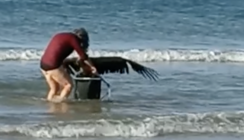 Una mujer ha protagonizado un bonito gesto en la playa de la Fontanilla de Conil. Esta alemana afincada en el municipio de Cádiz se encontraba paseando con sus perros cuando, de pronto, vio caer del cielo a un buitre leonado que se quedó en el rompiente de las olas.
