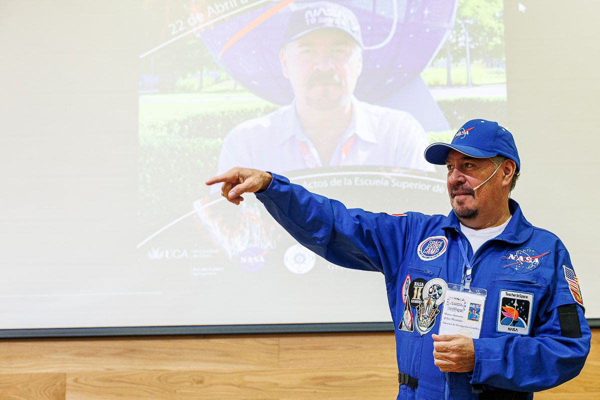 Bajo el atuendo cinematográfico -mono azul, lleno de escarapelas y banderas, gorra de béisbol- está Marco Antonio Vélez Montaño. El mexicano es el responsable de divulgar, en lengua española, todo lo referido al célebre acrónimo NASA, la mítica agencia espacial de Estados Unidos.