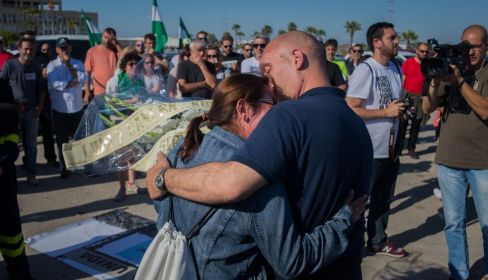 "Hoy honramos a los dos compañeros víctimas de la precariedad laboral que sufrimos. Que esa fuerza que estamos demostrando hoy aquí se la llevéis para vuestras vidas y os dé aliento", continua, al tiempo en que le entregan un ramo de flores a Chari, la viuda de José Luis Fossati. Ella, rota por dentro, llora en el pecho del hermano de su marido fallecido. La imagen deja en silencio a todos los presentes, quienes esperan unos segundos para reponerse y comenzar la marcha.