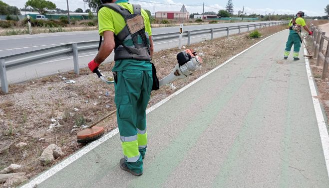 La actuación que se está desarrollando en el carril bici de la A-491 consiste en el tratamiento de márgenes, con labores de segado y despeje de vegetación, además del refuerzo del firme en varios puntos de este tramo.