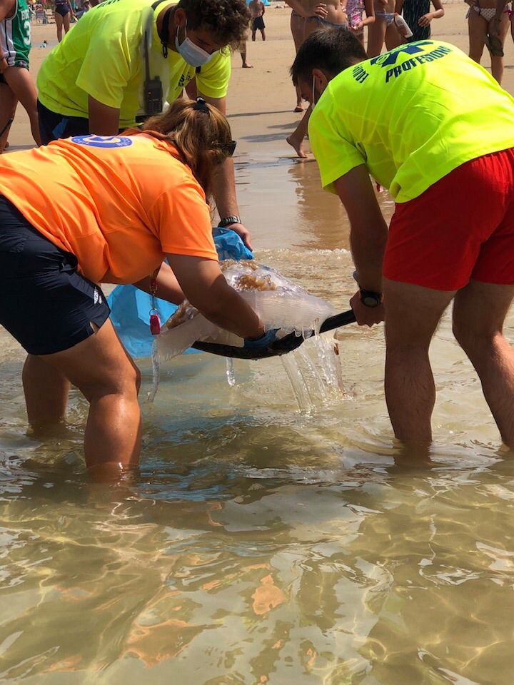 Según explicaba una usuaria, en unos minutos retiraron dos medusas de grandes dimensiones. Efectivos de Protección Civil, con las manos protegidas, fueron sacando y metiendo en bolsas estos organismos marinos.