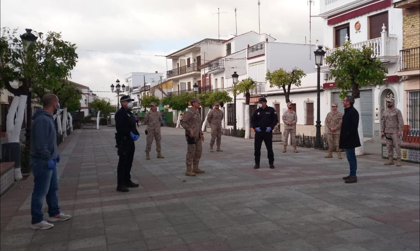 Daniel Pérez (a la derecha en la imagen) junto a miembros de Guardia Civil, Infantería de Marina y Policía Local de Puerto Serrano, en días pasados.