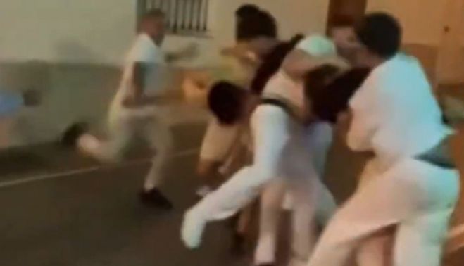 Patadas, empujones y puñetazos lanzados sin control protagonizaron una riña que parecía no tener bandos claros. En las imágenes difundidas en redes sociales, se aprecia cómo los jóvenes se enfrentan con una violencia desmedida, totalmente descontrolados y gritando insultos.