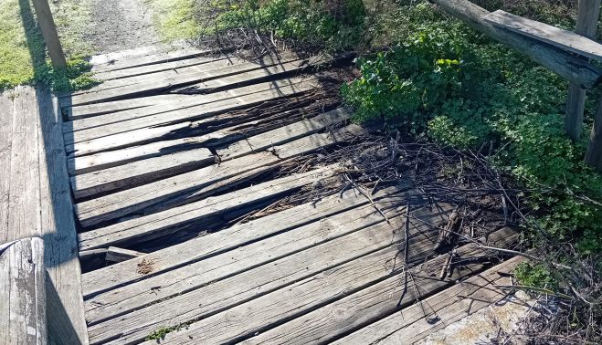 La revisión técnica municipal describe un escenario crítico: tablas de madera totalmente podridas, huecos en el pavimento, barandillas vencidas sin capacidad protectora y apuntalamientos provisionales que dejan entrever el agotamiento completo de la estructura. El documento advierte de un riesgo claro de tropiezos, caídas y hasta un posible colapso estructural del itinerario.